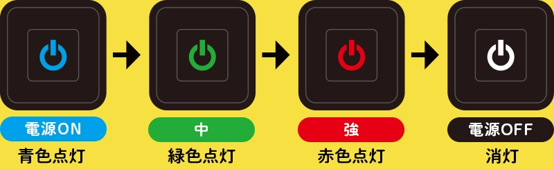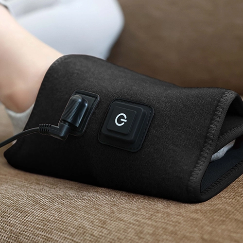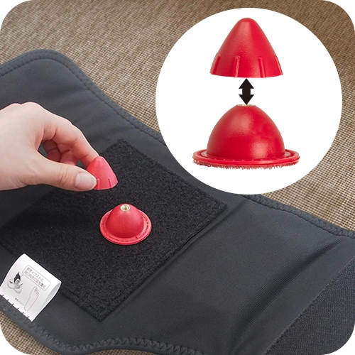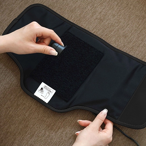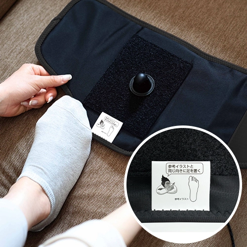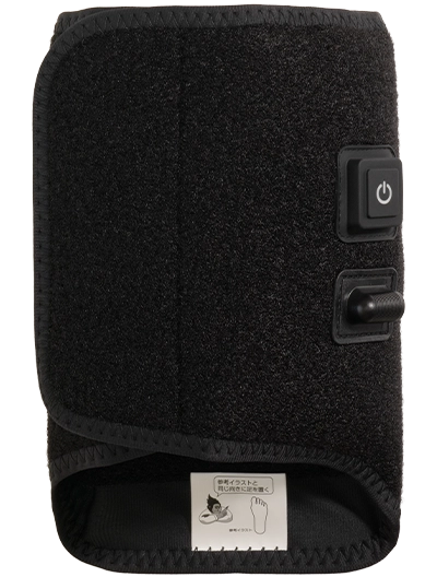 面ファスナーだから足に巻くだけの簡単装着。ボタン一つで電源オンオフ/強さ調整の操作が可能。だれでも簡単に使えます。