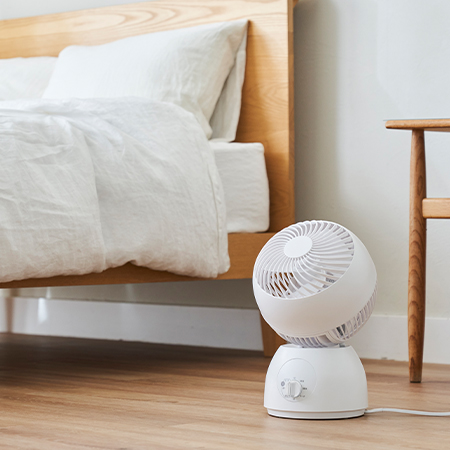 本体が360度回り、空気循環を促します。わかりやすい操作とシンプルなデザインでどんなお部屋でも調和します。