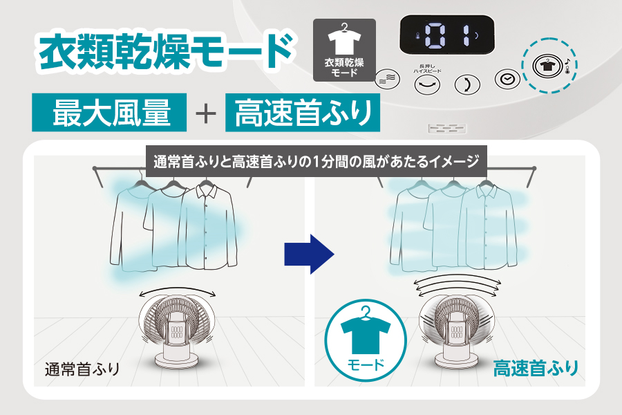 「最大風量」+「高速首ふり(通常の約2倍の速度)」で渇きにくい襟などにも満遍なく風を送ります。