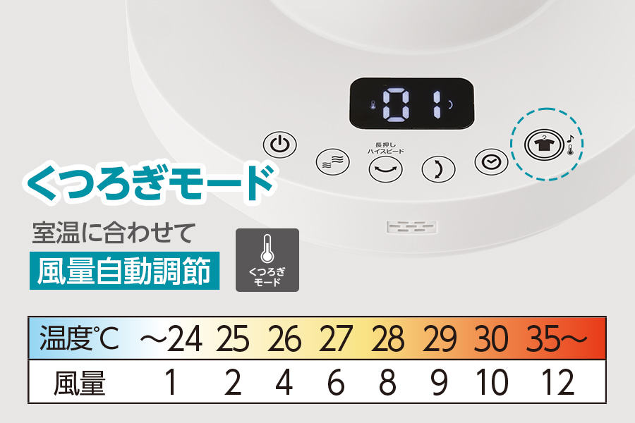 部屋の室温をセンサーで検知し、室温に対応した適切な風量で自動運転する「くつろぎモード」を搭載。